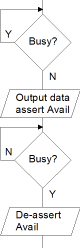 The parallel ports in the 68HC12 do not have built-in handshaking or strobe capability. Handshakes or strobes must be implemented either with external hardware or with software. Since input device handshaking, and input strobes, are best handled with the interrupt system, an example will be given in External Interrupts -- IRQ and XIRQ . Output device handshaking can be done completely in software in most cases. Reviewing an earlier figure for output device handshaking, we have modified it for full handshaking, calling the former strobe signal Avail, which is now de-asserted only after the output device asserts Busy. In addition, the output device only de-asserts Busy if Avail is low.