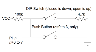 The DIP switches and four push buttons are connected in parallel from the pins of port H to ground. The four push buttons connect to the four least significant bits of port H, and in order to use these, the corresponding DIP switches must be in their open (up) position. Pull-up resistors hold the voltage levels high unless a push button is depressed or a DIP switch is in its lower position. This means that the push buttons will appear logically inverted - a low, 0 level, means depressed while a high, 1 level, means released.